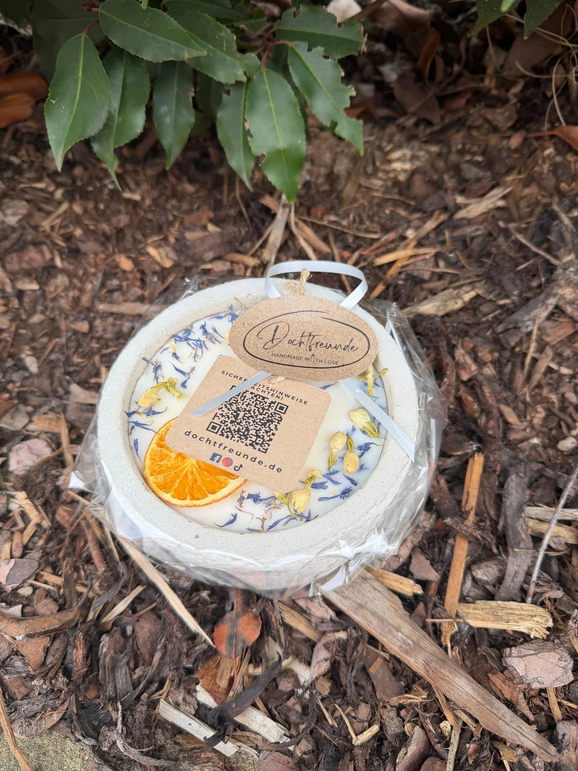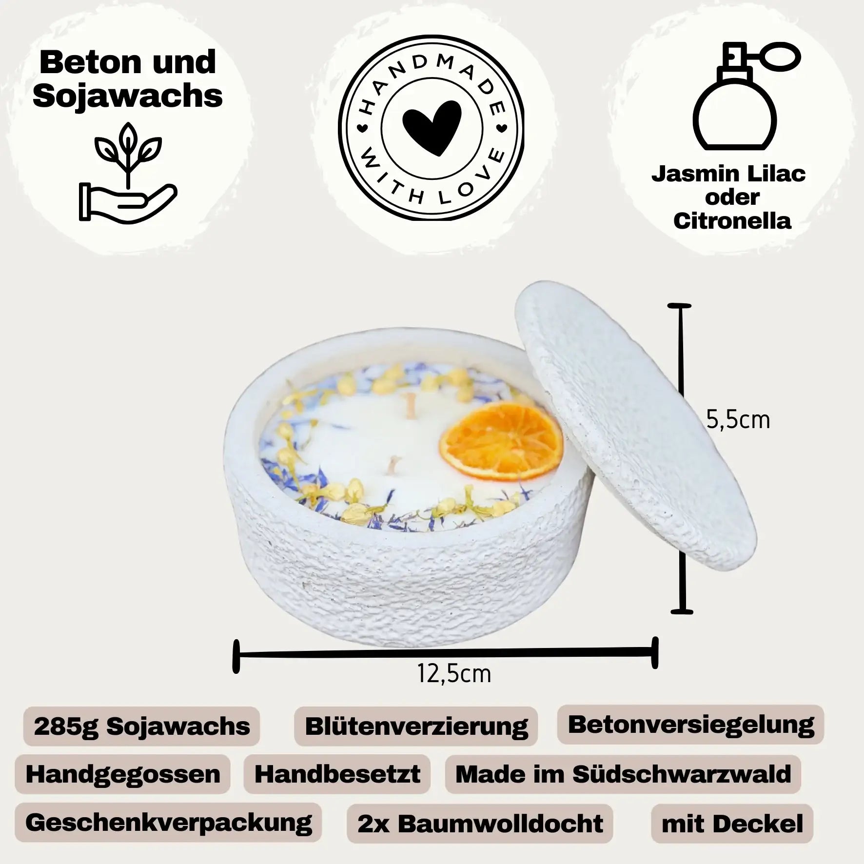 - Design: Hellgrauer Beton, dekoriert mit Orangenscheibe & blauen Blüten.