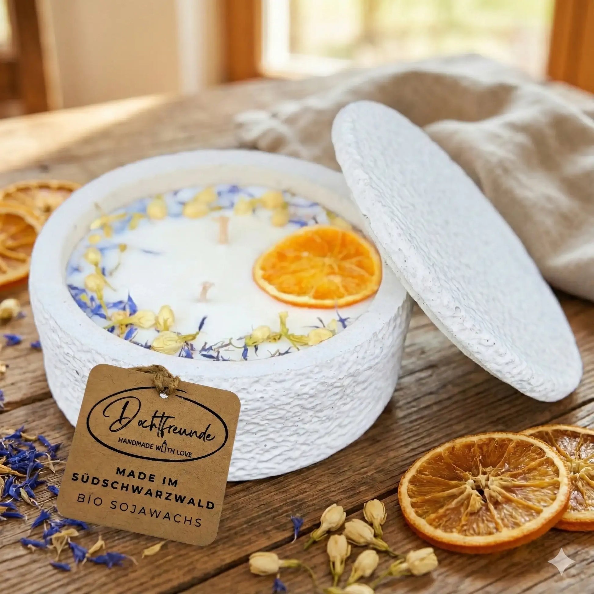 🍊 Passend zur Optik: Die Orangenscheibe harmoniert wunderbar mit unserem frischen Citronella-Duft (ideal auch für draußen!).
