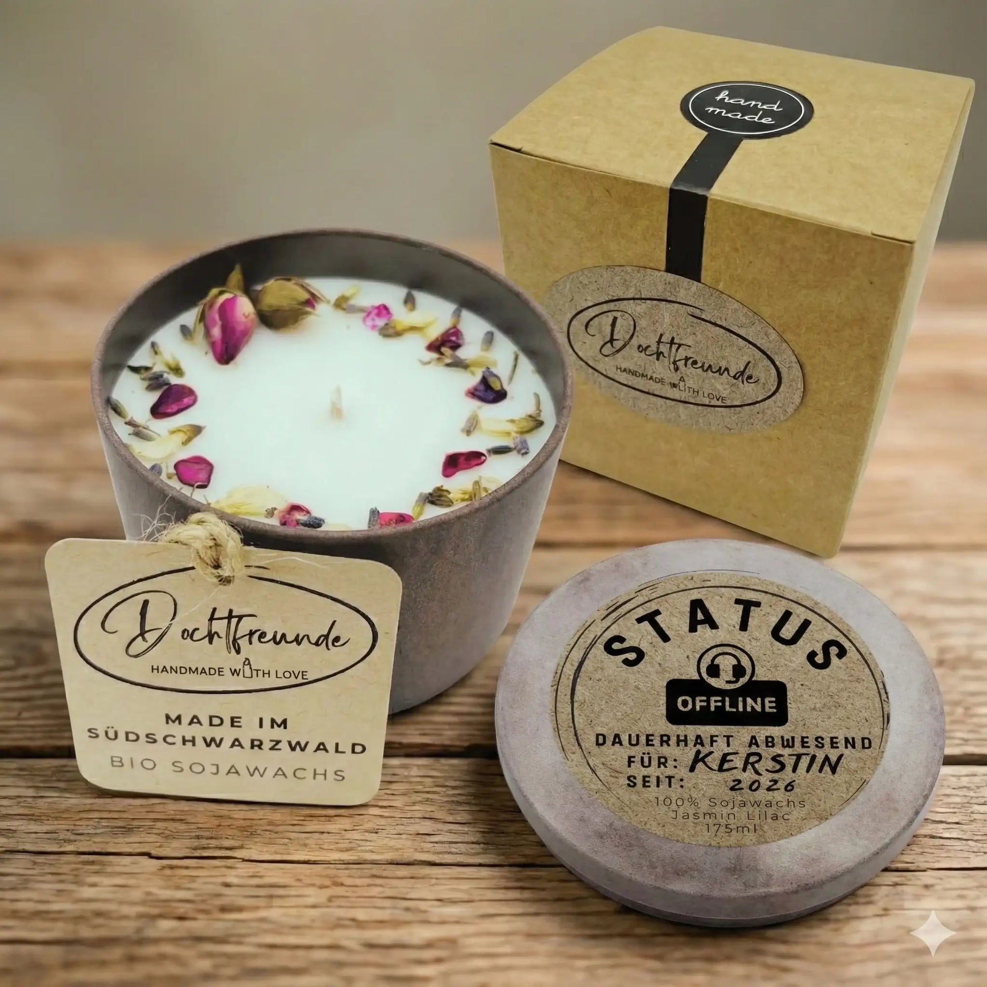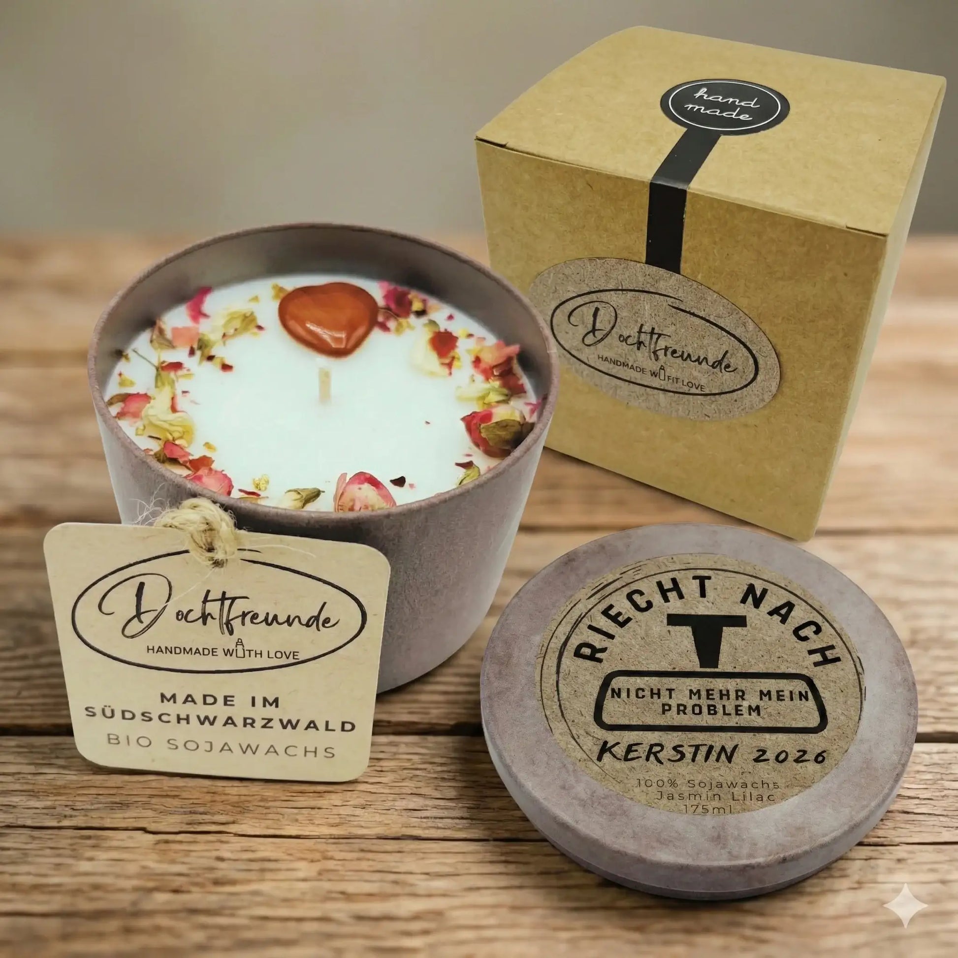 Wir machen deine Kerze zum Unikat. Wir drucken deinen Wunschnamen und das Jahr (z. B. 2026) direkt auf das Etikett. Ob „Für Kerstin“ oder „Von deiner Abteilung“ – wir setzen deine Botschaft professionell um.