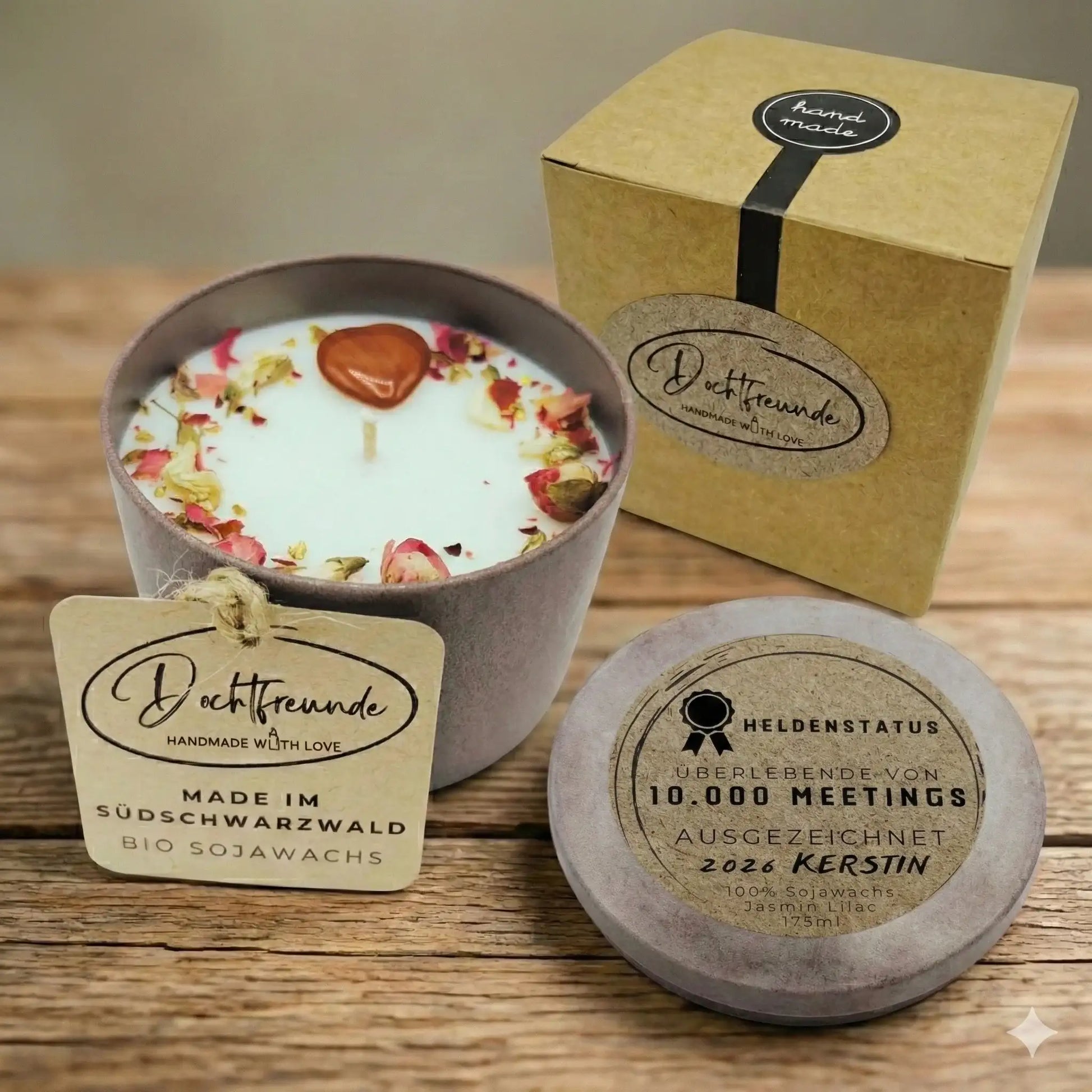 - Botanische Veredelung: Mit Liebe von Hand gegossen und mit echten Trockenblumen verziert.