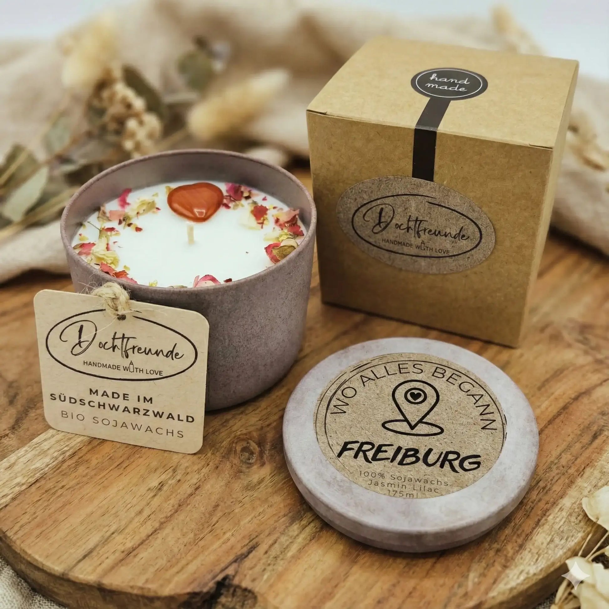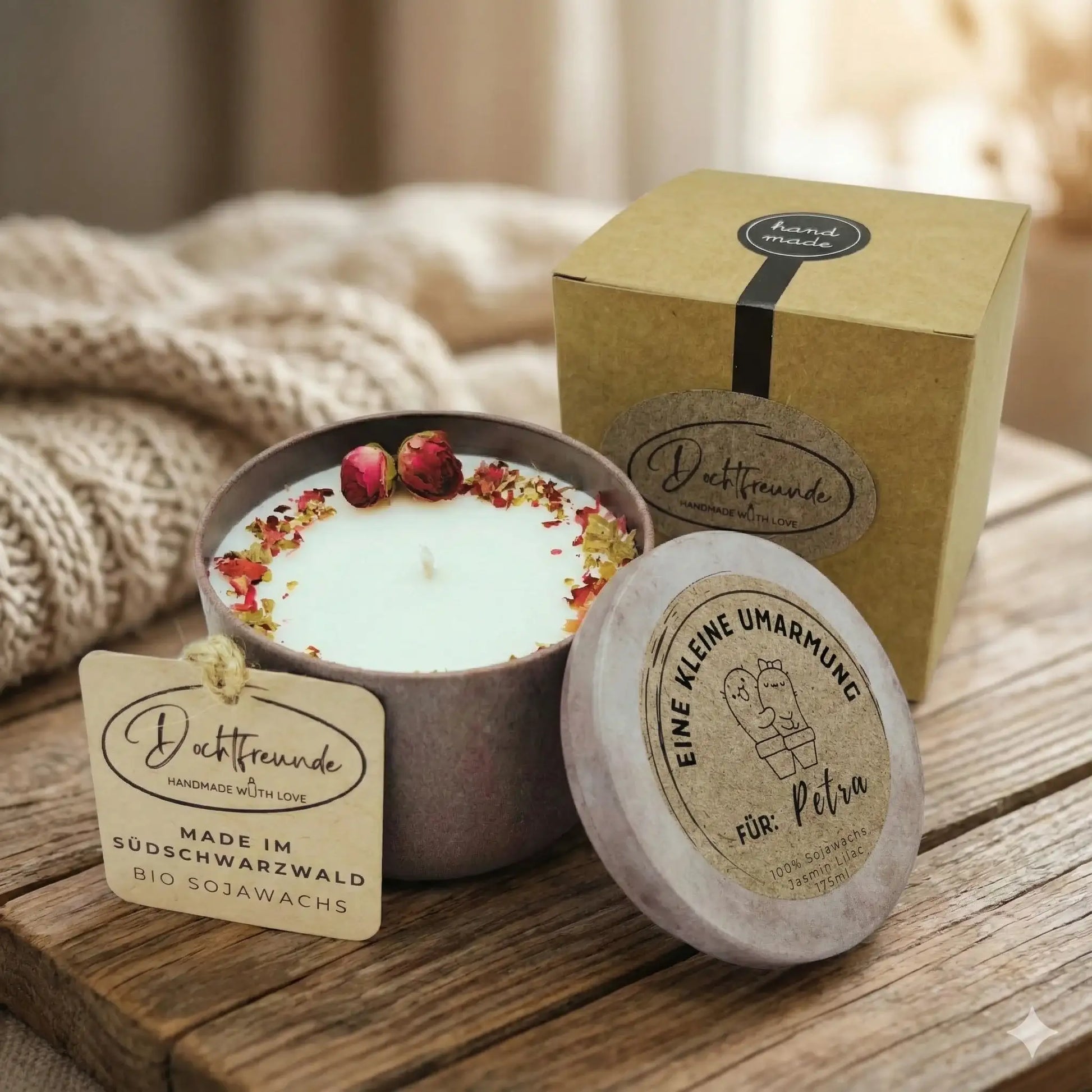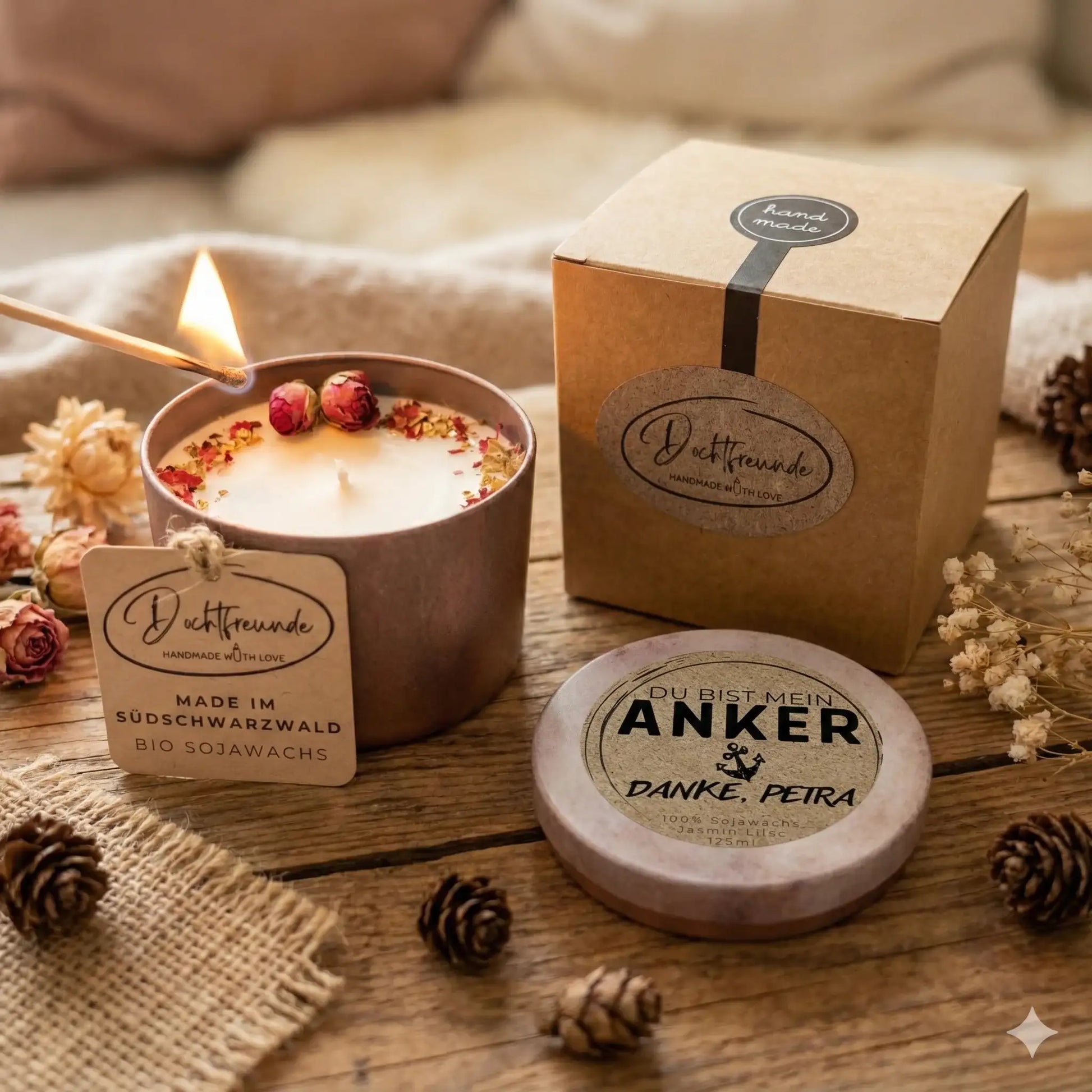 Vergiss unpersönliche Standard-Geschenke. Mit einer DochtFreunde Valentinstagskerze verschenkst du ein echtes Unikat, das von Herzen kommt und lange in Erinnerung bleibt. Ob als romantischer Liebesbeweis, kleine Aufmerksamkeit zwischendurch oder als Überraschung für deinen Lieblingsmenschen – jede Kerze wird in unserer Manufaktur im Südschwarzwald von Hand für dich gefertigt.