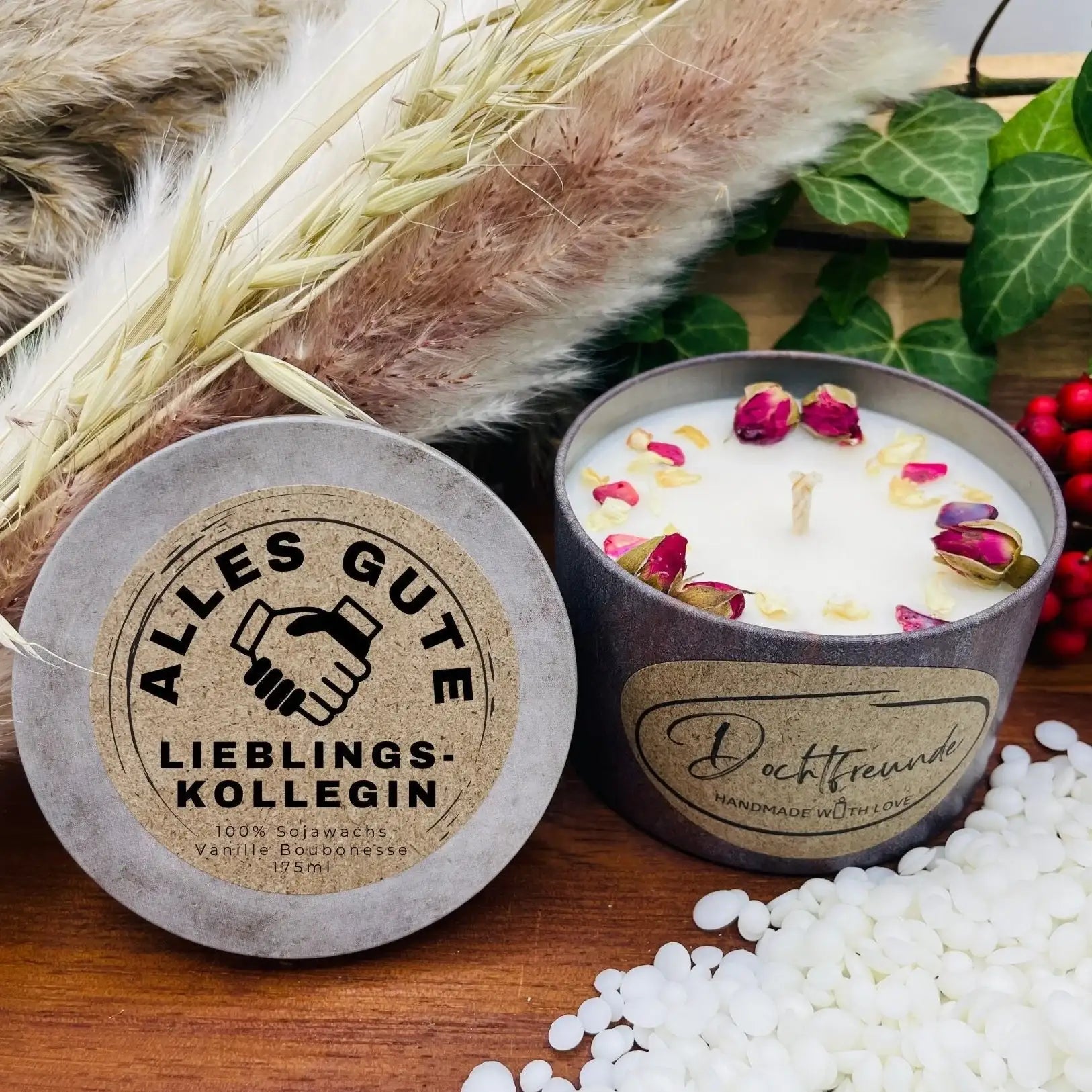 Diese personalisierte personalisierte Duftkerze Kollegin steht für Dankbarkeit, positives Miteinander und bewusst gestaltete Momente – als Geschenk für deine Lieblingskollegin oder als kleine Aufmerksamkeit mit großer Wirkung.