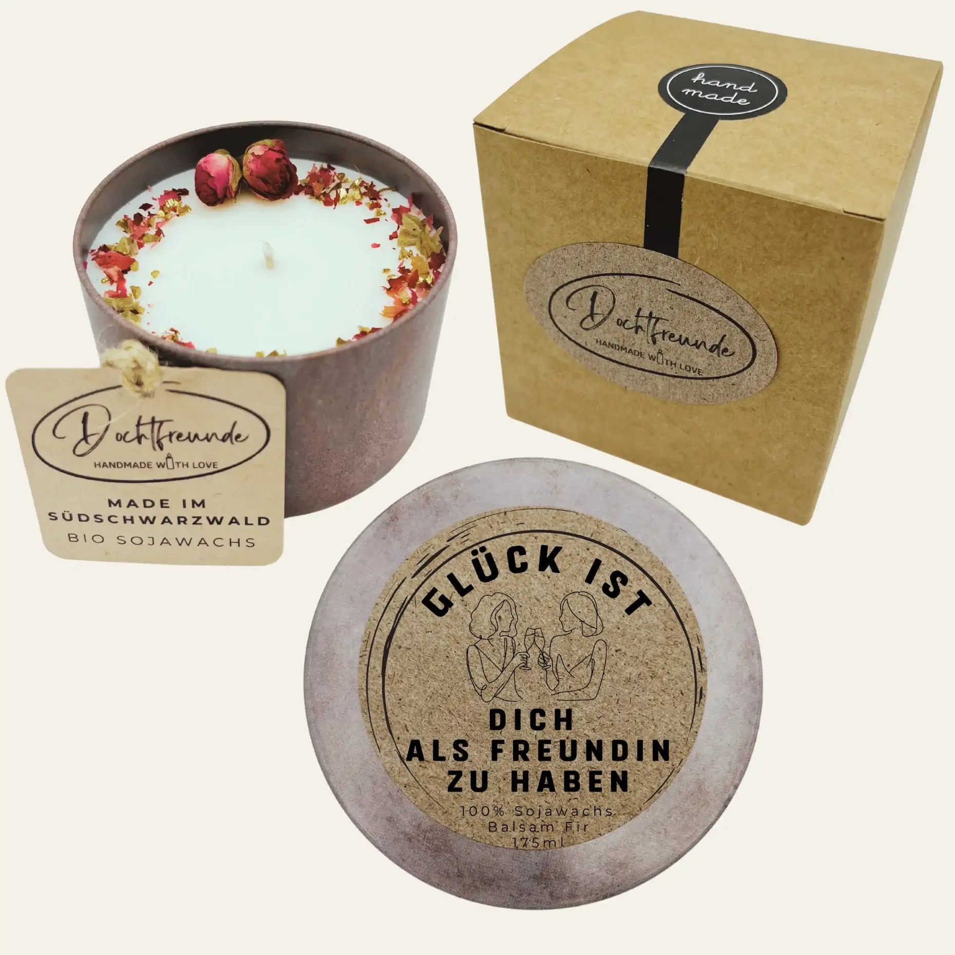 Personalisierte Duftkerze mit Deckel Handbesetzt „Glück ist dich als Freundin zu haben“ – Geschenk Handmade im Südschwarzwald