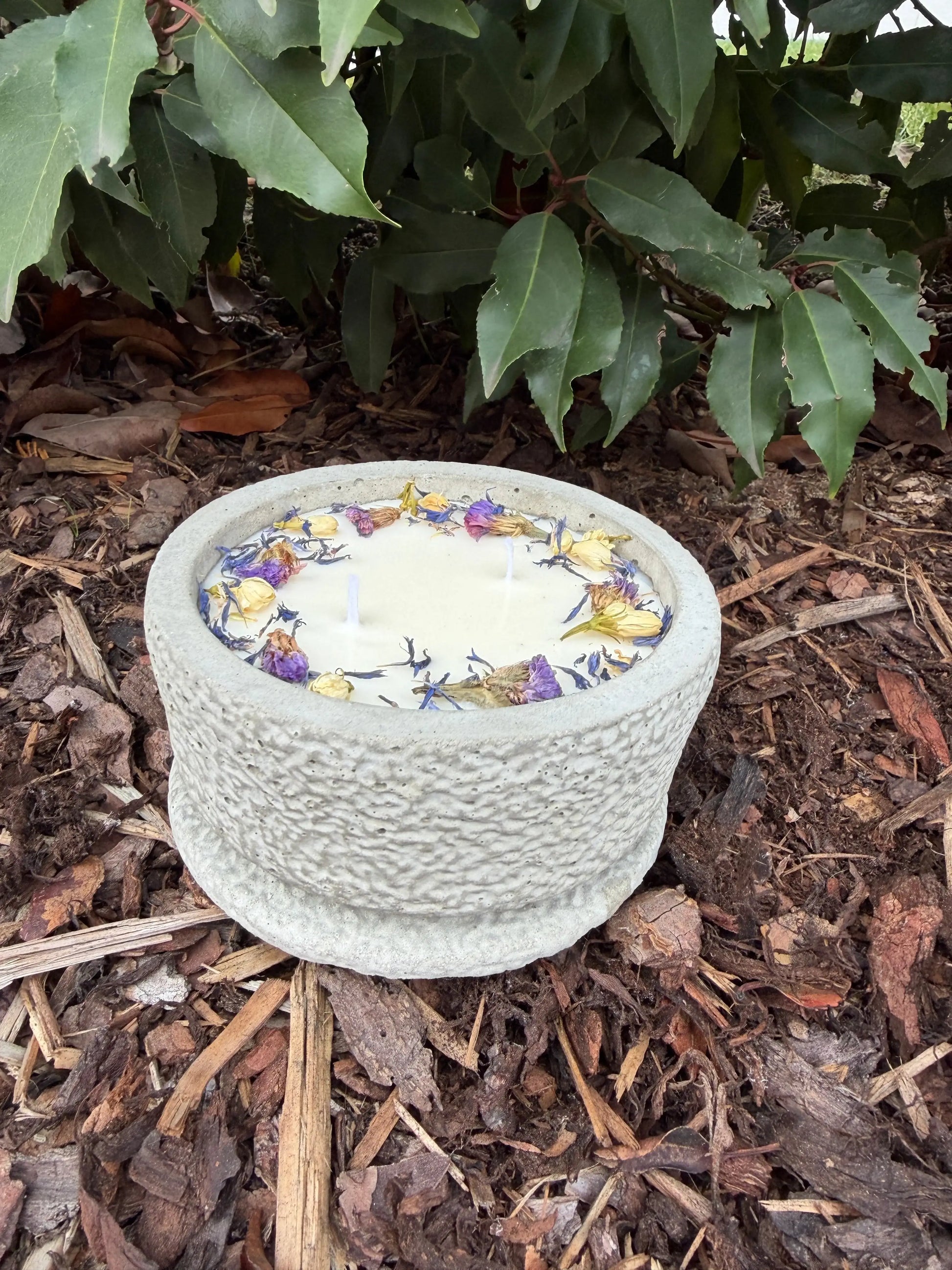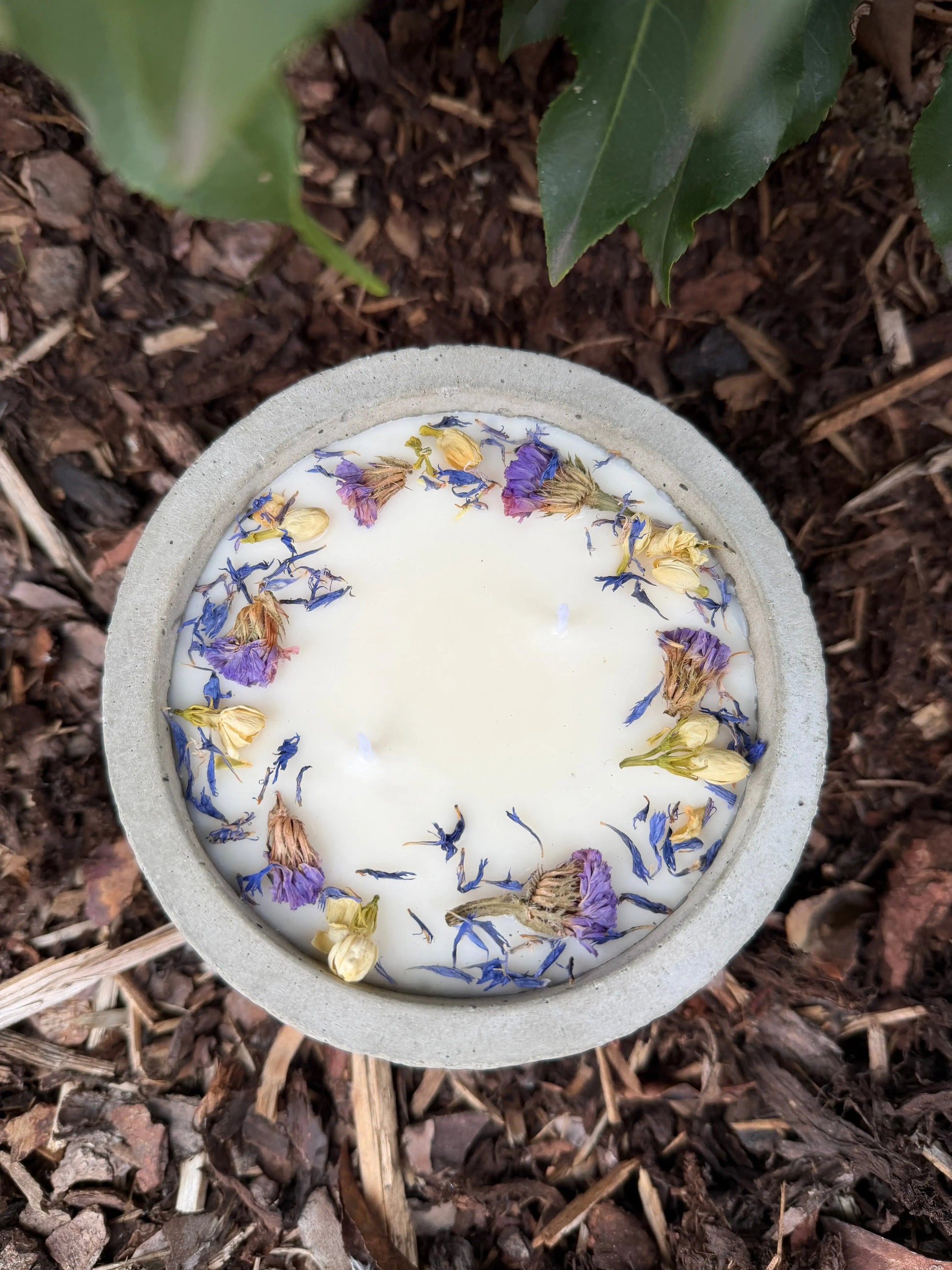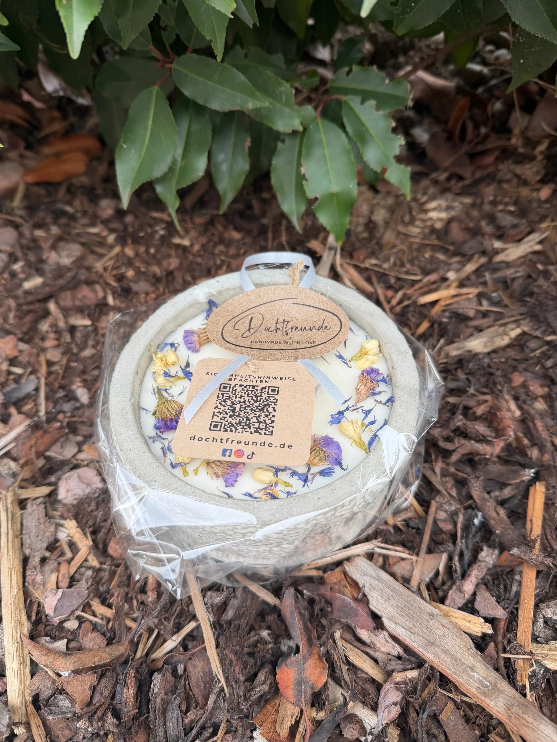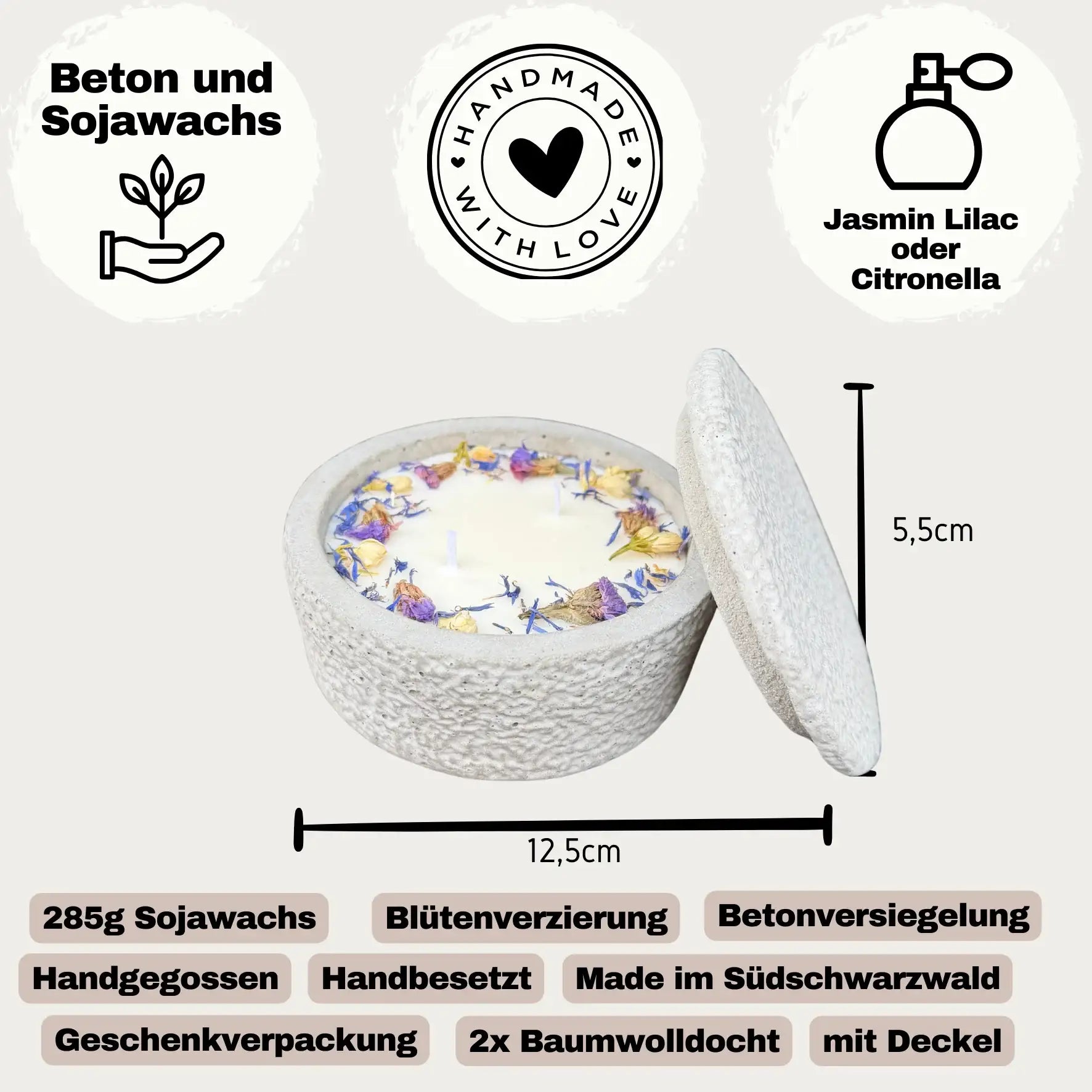 - Design: Hellgrauer Beton ("Grey"), veredelt mit blauen & lila Trockenblumen.